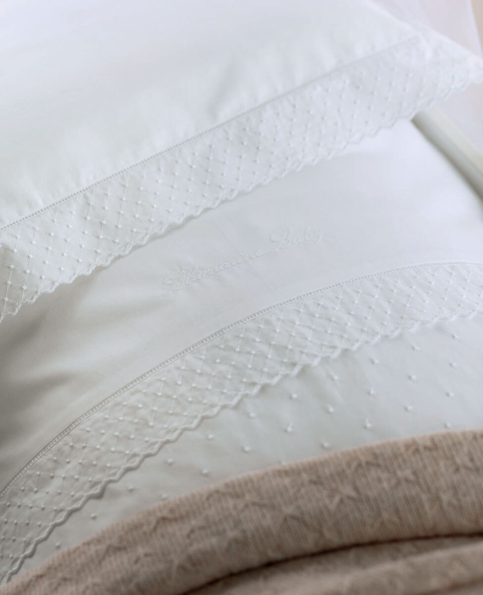 ompleto copripiumino per culla ricamato con orlo a-jour e logo Blumarine ricamato.