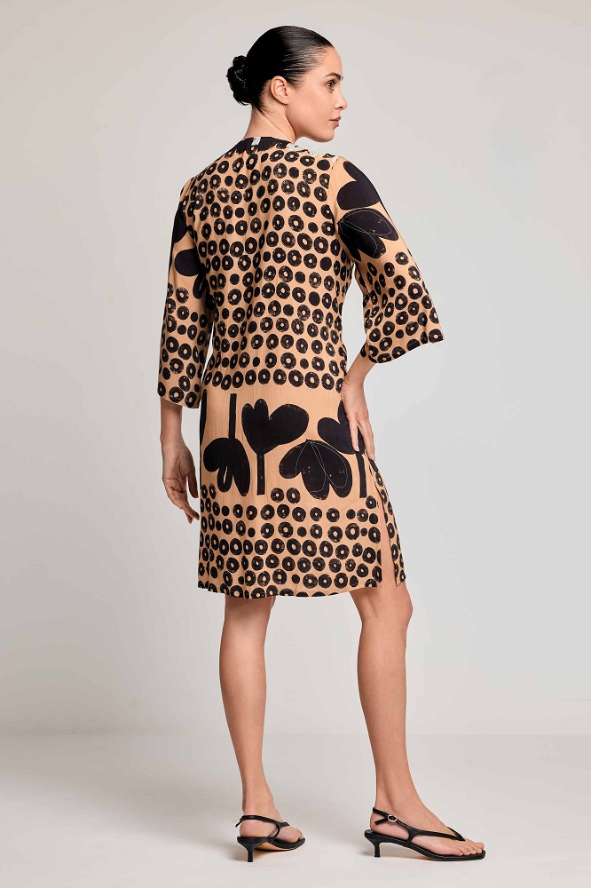 Il vestito Johanna è pensato per chi ama vestire comoda senza rinunciare allo stile. La linea ampia e fluida, unita al tessuto in viscosa, garantisce una sensazione di leggerezza e freschezza. La stampa colorata effetto paintballs aggiunge vivacità al look.