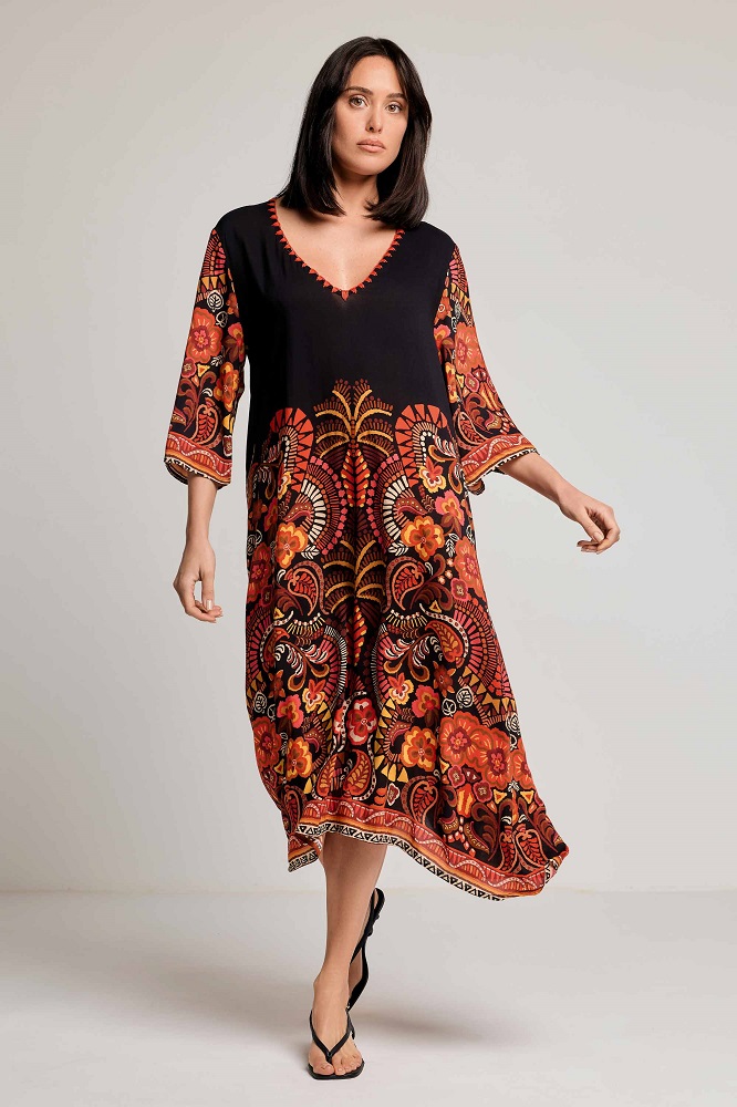 Il kaftano Kim, in viscosa, รจ un capo versatile e stiloso per le giornate estive. Il taglio ampio e il tessuto leggero lo rendono perfetto da indossare in vacanza.