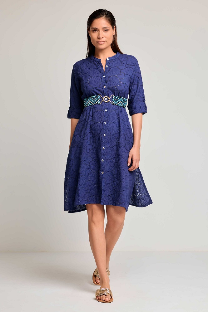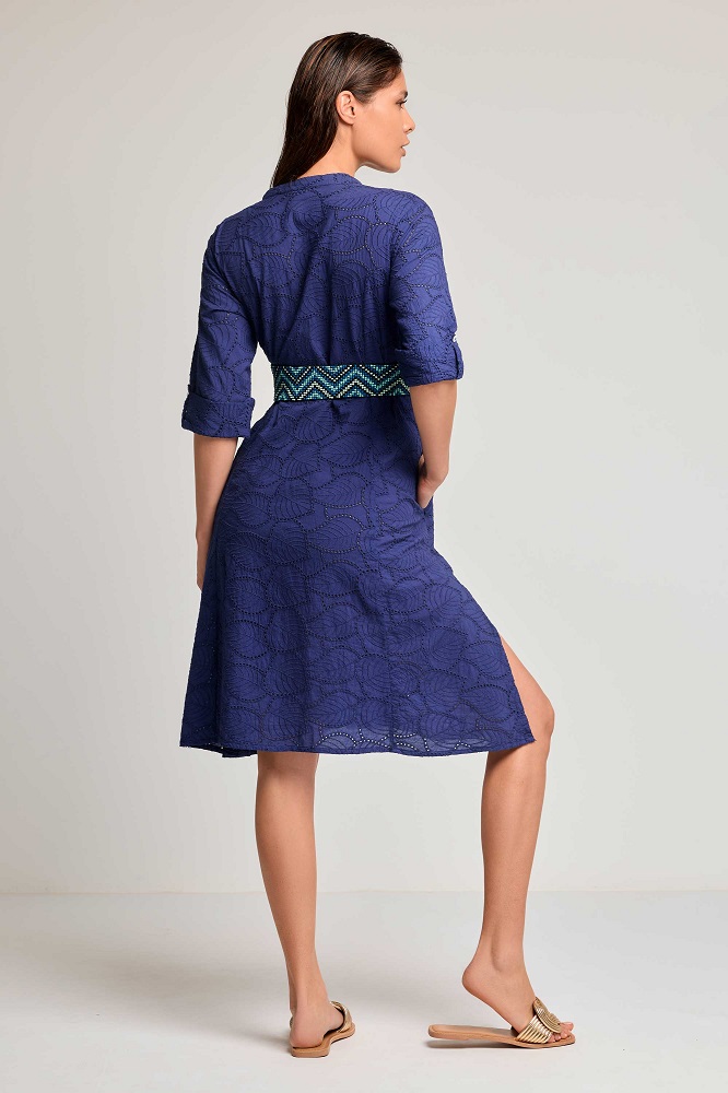 Il vestito camicia Sage è realizzato in 100% cotone, offrendo una sensazione di leggerezza e comfort ideali per le giornate estive. Il design presenta una silhouette rilassata con abbottonatura frontale e maniche a 3/4 con polsini abbottonati. Le tasche laterali aggiungono praticità al capo.