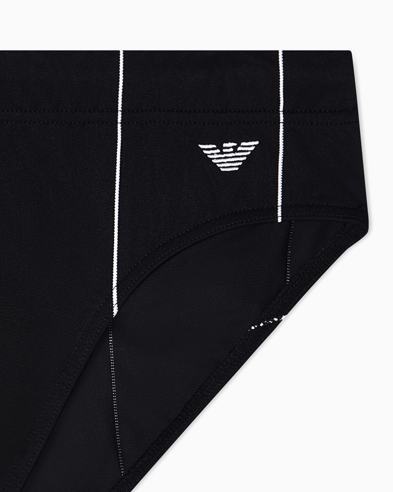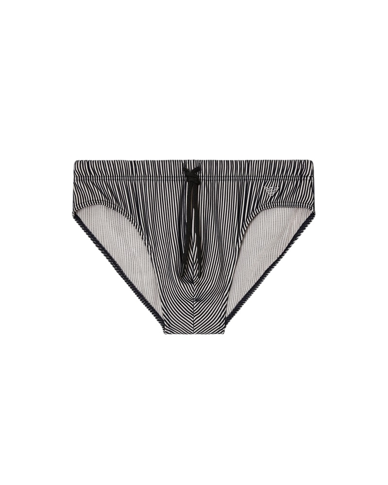 Costume modello slip con coulisse in vita, caratterizzato da stampa con fitto motivo a righe verticali.
