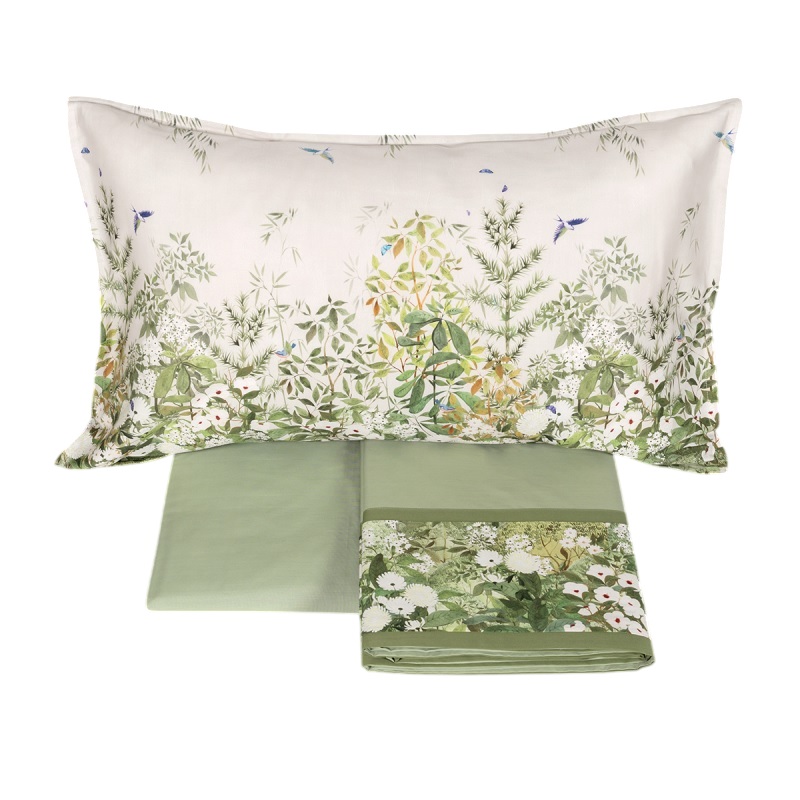 Il lenzuolo NARA si ispira all’eleganza essenziale dell’estetica giapponese tipica dell’antica capitale del Giappone da cui prende il nome. Completa le proposte della collezione rievocando la leggerezza poetica dei paraventi orientali. Il disegno è il risultato di uno studio attento e ricercato: delicate progressioni di vegetazione, fiori bianchi e piccoli uccellini compongono una scena incantataEntrambi i lati delle federe a quattro volanini e l’ alta balza del lenzuolo sono in raso 300TC stampato in digitale: Tutto il resto del completo e’ in percalle di puro cotone tinta unita