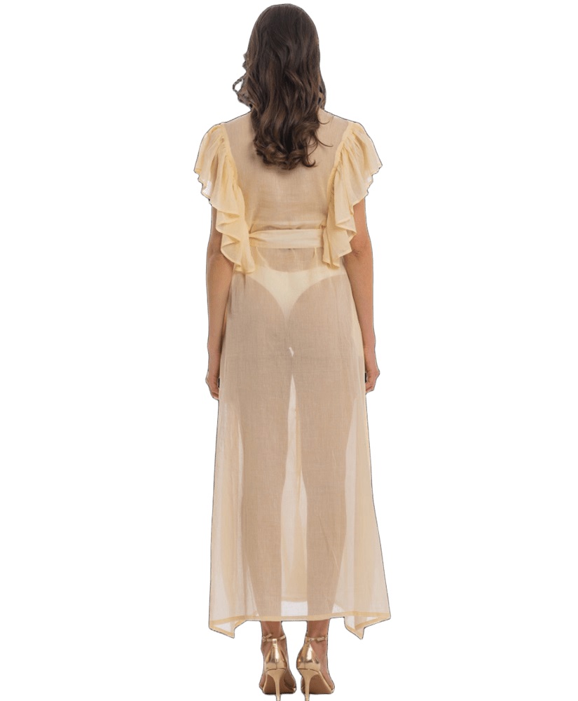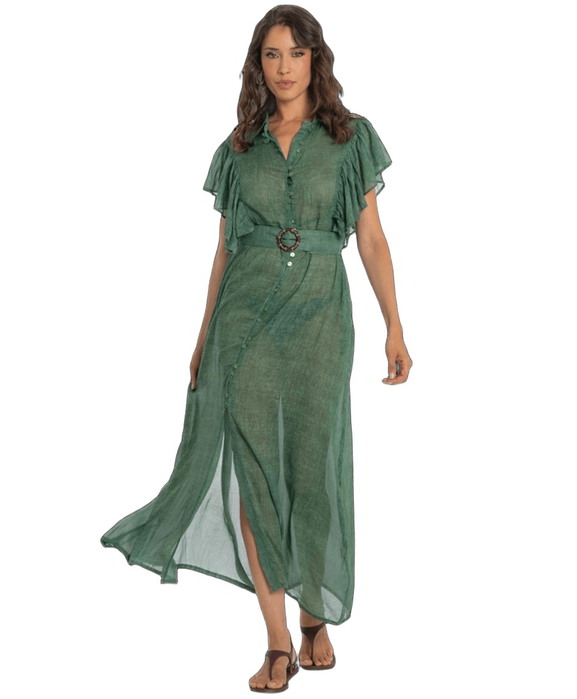 Abito lungo in mussola di cotone maltinto con bottoni e cintura.