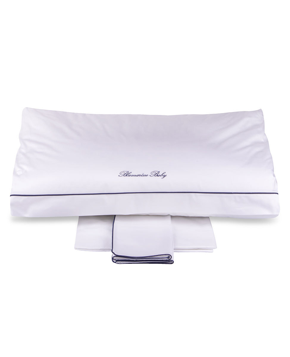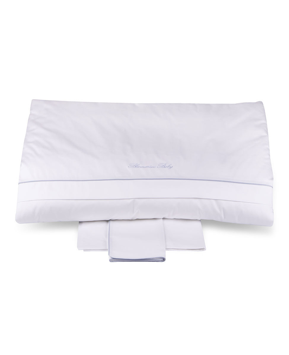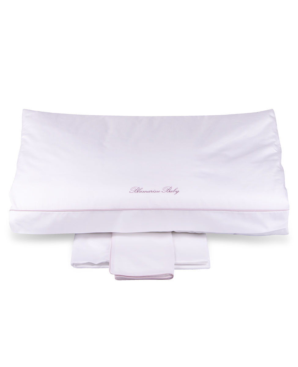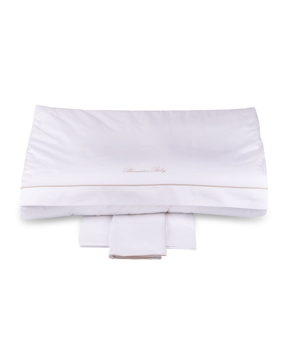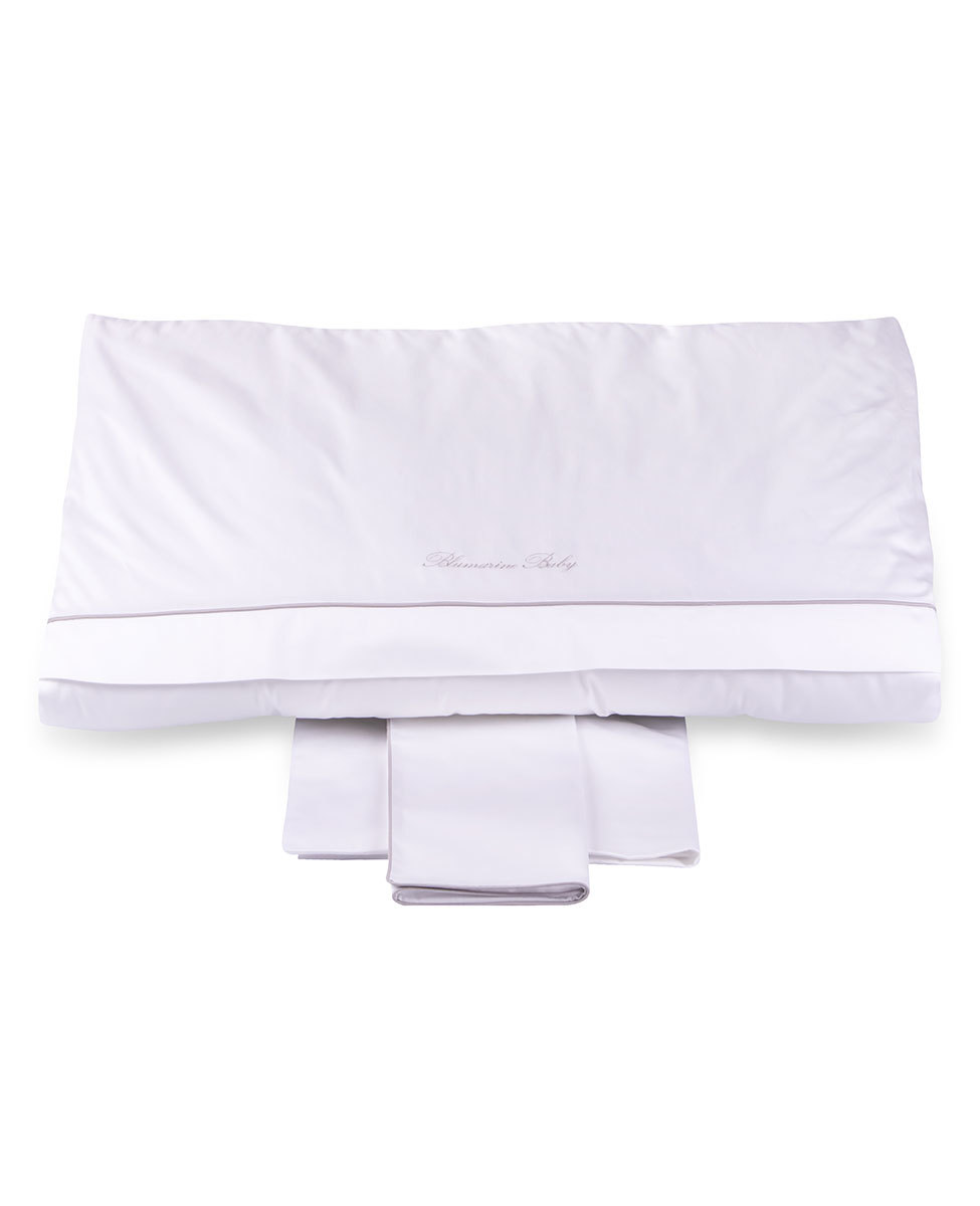 Completo copripiumino per culla in raso di cotone tinta unita con profilo a contrasto e logo Blumarine Baby ricamato.
