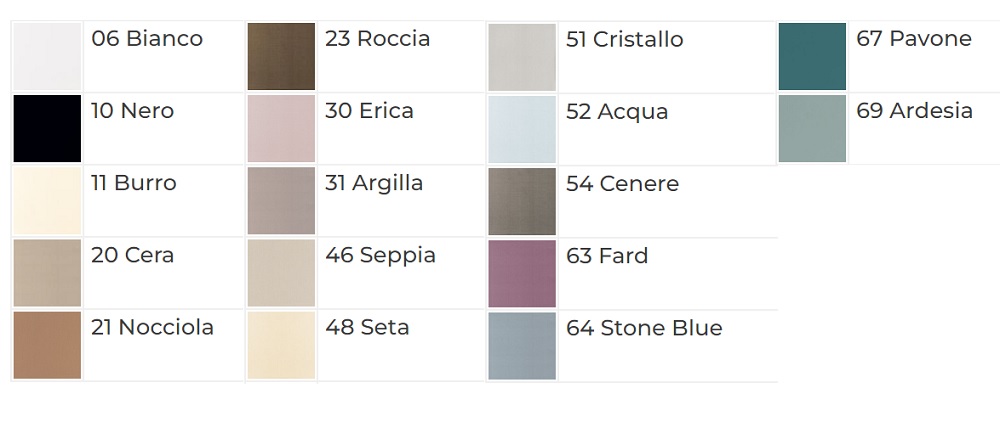 Colore | 46 Seppia, 64 Stone Blue, 06 BIANCO, 10 NERO, 11 BURRO, 20 CERA, 21 NOCCIOLA, 23 ROCCIA, 30 ERICA, 31 ARGILLA, 48 SETA, 51 CRISTALLO, 52 ACQUA, 54 CENERE, 63 FARD, 67 PAVONE, 69 ARDESIA |